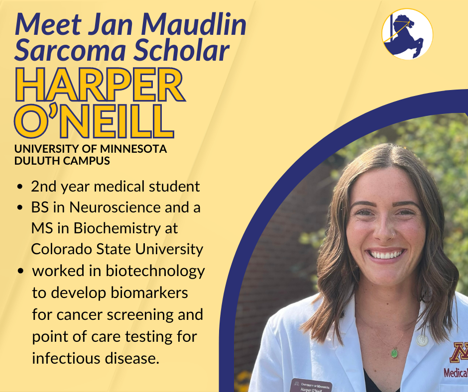 Harper is a second year medical student at the University of Minnesota School Duluth campus. She earned a BS in Neuroscience and a MS in Biochemistry at Colorado State University. Prior to medical school, she worked in biotechnology to develop biomarkers for cancer screening and point of care testing for infectious disease. She is interested in oncology as a specialty, and is passionate about the intersection of medicine, research, and education. As a sarcoma scholar, she is excited to teach others about sarcomas, contribute to research, and connect with patients and their communities.